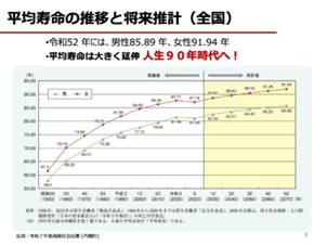 日本人の平均寿命は年々延びており、昭和22年には男性が50.6歳、女性が53.96歳だったのが、令和6年には男性が81.09歳、女性が87.13歳となっています。そして平均寿命の推移と将来推計を見てみると、令和52(2070)年には男性が85歳、女性が90歳を超えるとされています。