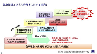 こちらが健康経営の考え方を図式化したものです。健康診断などは当たり前にやっていらっしゃる企業が多いと思いますが、そこからさらに健康に対する細かい投資をしていき、従業員一人ひとりの健康が促進されることによって組織が活性化し、企業価値が上がることをゴールとしています。