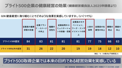 健康経営に取り組む企業にどのような効果を実感しているかのアンケートを実施したところ、このような結果が出ました。「ブライト500」とは、健康経営優良法人に認定されている中小企業の中でも、特に優れている上位500社に与えられる称号です。