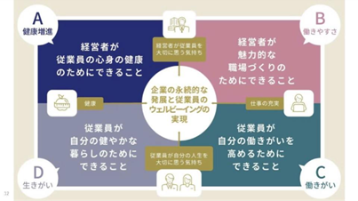 左下が「生きがい」です。これは完全に個人の領域ですが、夢や目標を持ち、地域や社会とのつながりを持っている人は生産性が高いというエビデンスがあります。人生を前向きに、生き生きと過ごしている人ほど、仕事においても高いパフォーマンスを発揮するのです。