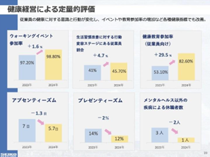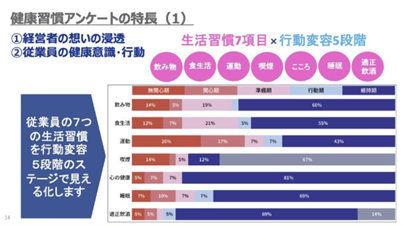 健康経営に対する定量的な評価としては、生活習慣改善の変容ステージ等の定量指標を継続的に測定し、社内外に公表しております。