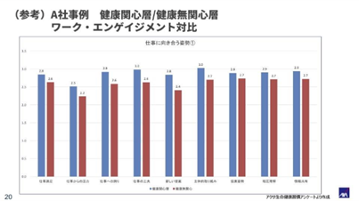 さらに注目すべきは「ワーク・エンゲージメント」です。仕事に取り組む姿勢や仕事への誇りなどの9項目をポイント化すると、健康関心層の方が明らかに高くなっています。