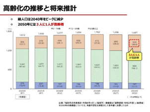 福岡市の高齢化の将来推計によると、令和32(2050)年には3人に1人が高齢者という構造になります。10〜14歳までの年齢のパーセンテージは大きく変わりませんが、生産年齢人口はどんどん減少していきます。