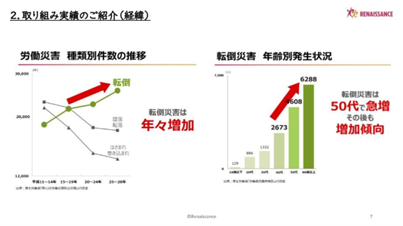 こちらの折れ線グラフは労働災害の種類別件数の推移を表したものです。労災自体は減っているのですが、転倒だけを切り取ると右肩上がりで増えています。