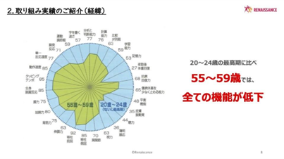こちらの図は、体の機能のピークと言われる20~24歳の能力を100とした時、55~59歳の身体機能を相対的に示したものです。平衡機能、回復能力、視力、関節能力、握力など、全てが低下しています。