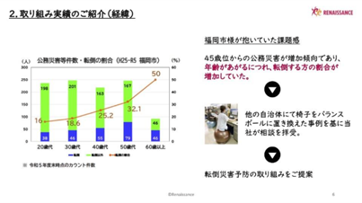 こうした課題意識から、他自治体で行われていた「職員の椅子をバランスボールに置き換える」という取り組み事例をもとに、福岡市のご担当の方が当社にご相談くださり、2024年に共同で実証事業を行うことになりました。テーマは「転倒しない体づくり」です。