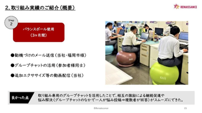 この実証事業の特徴は、単にバランスボールを納品するのではなく、当社のノウハウを活かしてソフト面の取り組みも組み合わせている点です。具体的な内容は、日常的に運動習慣のない40歳以上の福岡市職員100名を対象に、椅子をバランスボールに置き換えるとともに、隙間時間でできる簡単なエクササイズに3か月間取り組んでいただくというものです。