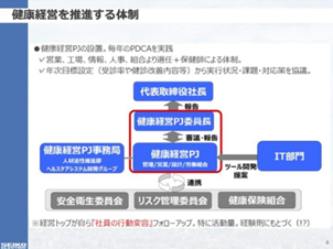 健康経営の推進体制としては、社長をトップとし、情報部門の執行役を委員長とする「健康経営プロジェクト」を設置しています。私は人事としてこのプロジェクトの事務局を担当し、ツール開発などは社内のIT部門が行っています。