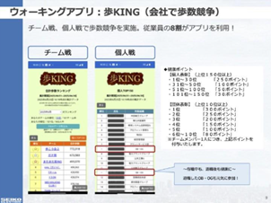 またバーチャルウォーキングも導入しており、本社から古賀工場までの約60kmのコースと、東京支社周辺の穴場巡りコースを作成しています。アプリ上で従業員の進捗が可視化されるため、何周も回っている強者がいることを知れたり、経営層が隣を歩いていたりするのも面白い点です。