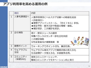 松田:さらにアプリの利用率を高める運用として、アプリのインストールや健診受診などのヘルスケア活動を人事考課項目に追加しました。また、二次健診を1人あたり5,000円まで補助したり、全社員にウェアラブル活動量計を無償支給するなどの取り組みも行っています。