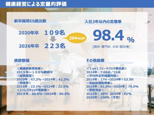 採用面にも効果が出ており、「ホワイト500」で検索して応募する学生が増え、2020年以降、志望者数は約2倍に増加しました。定着率も高く、今年は2名退職したため98%となっていますが、直近4年間は100%を維持しています。