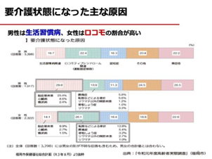 松村:では、そもそも何が原因で介護が必要になっているのでしょうか。男性は脳血管疾患や心臓病などの生活習慣病、女性は大腿骨頸部骨折や腰痛などのロコモが多いと言われています。また福岡市の国民健康保険の医療費の内訳を見ると、生活習慣病が4割近くを占めています。
