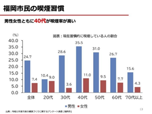 令和2年の平均寿命と令和元年の健康寿命の差を算出したところ、福岡市では男性が9.66年、女性が13.65年と、国の平均よりも少し長めでした。この差を縮めていくことが今後の課題です。なお先日、令和4年度の健康寿命のランキングが出たのですが、福岡市は政令指定都市の中で女性が1位、男性も9位と、徐々に改善してはいます。