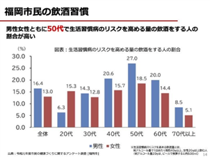 生活習慣病を予防するためには、基本的な生活習慣の見直しが大切です。令和元年度に福岡市民にアンケートを取ったところ、運動習慣のない層は30〜50代の働き盛り世代に多く、特に30〜40代の女性では6割という結果が出ました。